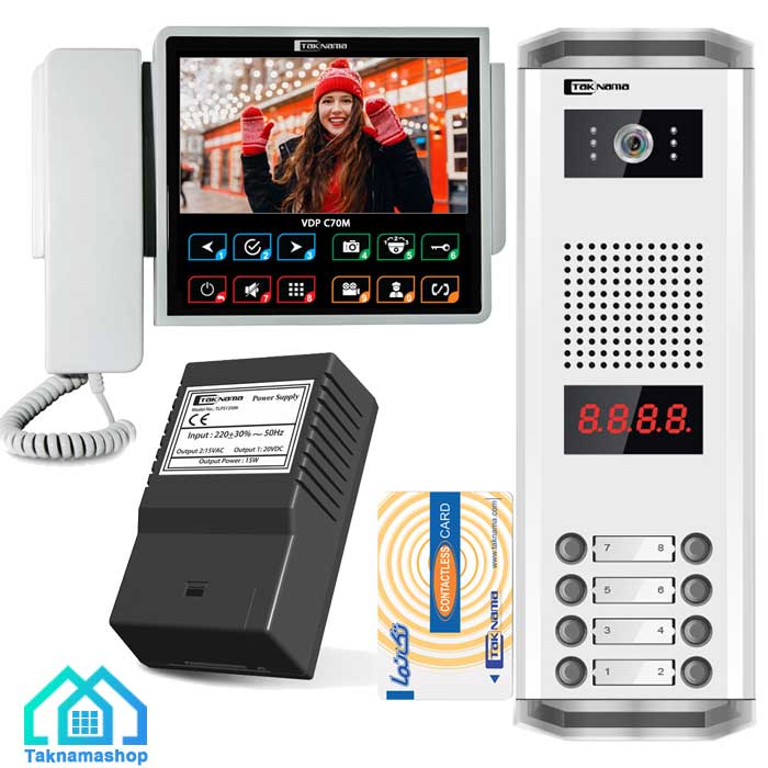 پکیج آیفون تصویری هشت واحدی تکنما شماره 16 یک پکیج همه چیز تمام است و هر آنچه که از یک پکیج ایده آل انتظار داشته باشید را در خود جای داده است. این پکیج هشت واحدی آیفون تصویری به مانتیوری 7 اینچی در مدل c70m مجهز شده که حافظه خور است و از سویی قابلیت ارتباط داخلی دارد. کلید های مانیتور همگی لمسی هستند و کیفیت بدنه بسیار خوبی نیز دارد.